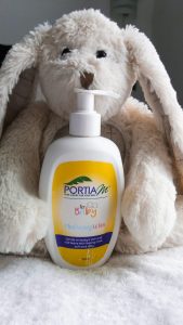 After bathing him I pat his skin dry with a towel and play a game of “row-row your boat” while rolling him in the towel so he can dry. I then start to massage him with the PortiaM Baby lotion. It smells clean and lingers for a while on the skin.
